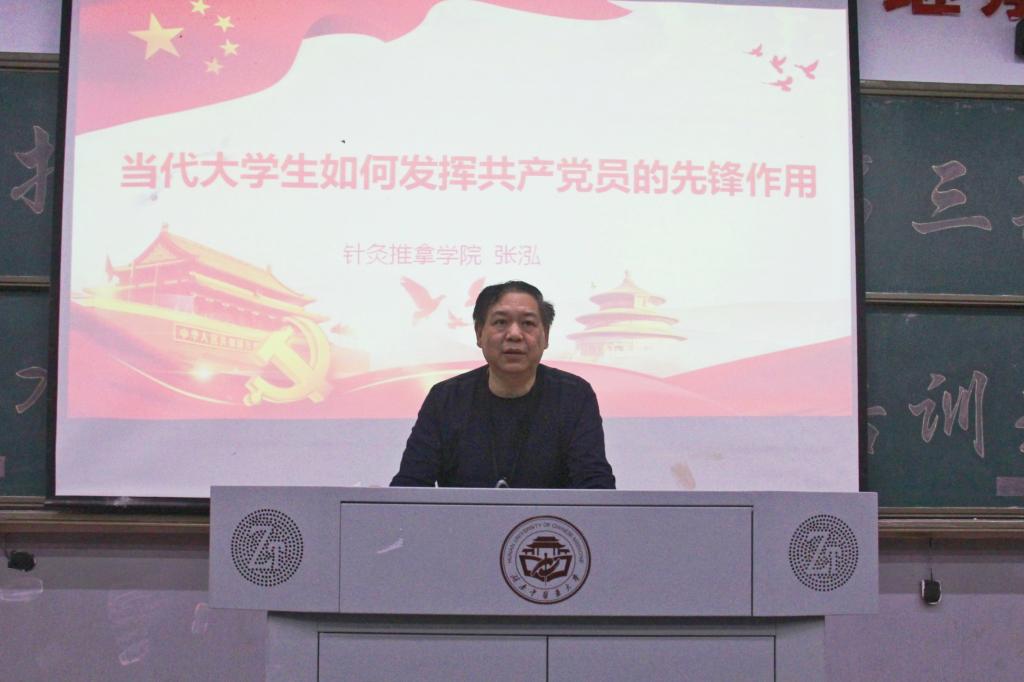 2021年4月14日19点,在湖南医药大学含浦校区二号教学楼2506教室,本期入党积极分子培训班全体学员上了一堂“当代大学生如何发挥共产党员的先锋作用”党课,授课人为针灸推拿学院副院长张泓教授。