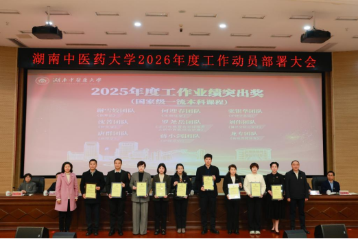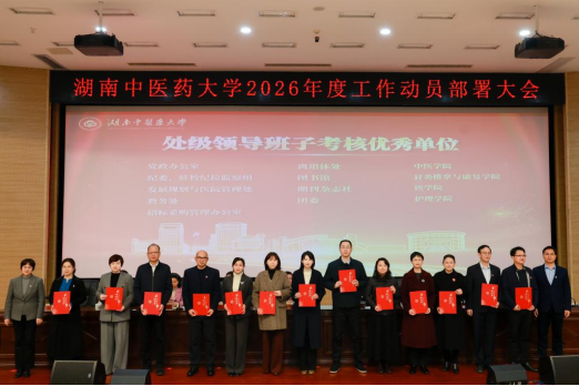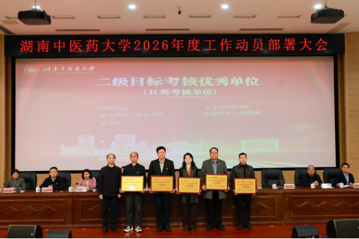 3月20日,在湖南中医药大学2026年度工作动员部署大会上,我院荣获四项重磅荣誉:学校“2025年度处级领导班子考核优秀单位”及“2025年度二级目标考核优秀单位”;院长岳增辉教授荣膺国家中医药管理局“岐黄学者”;沈菁老师团队荣获学校“2025年度工作业绩突出奖”。