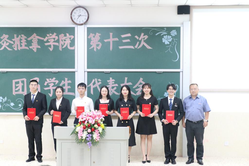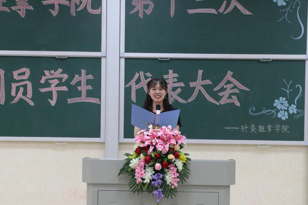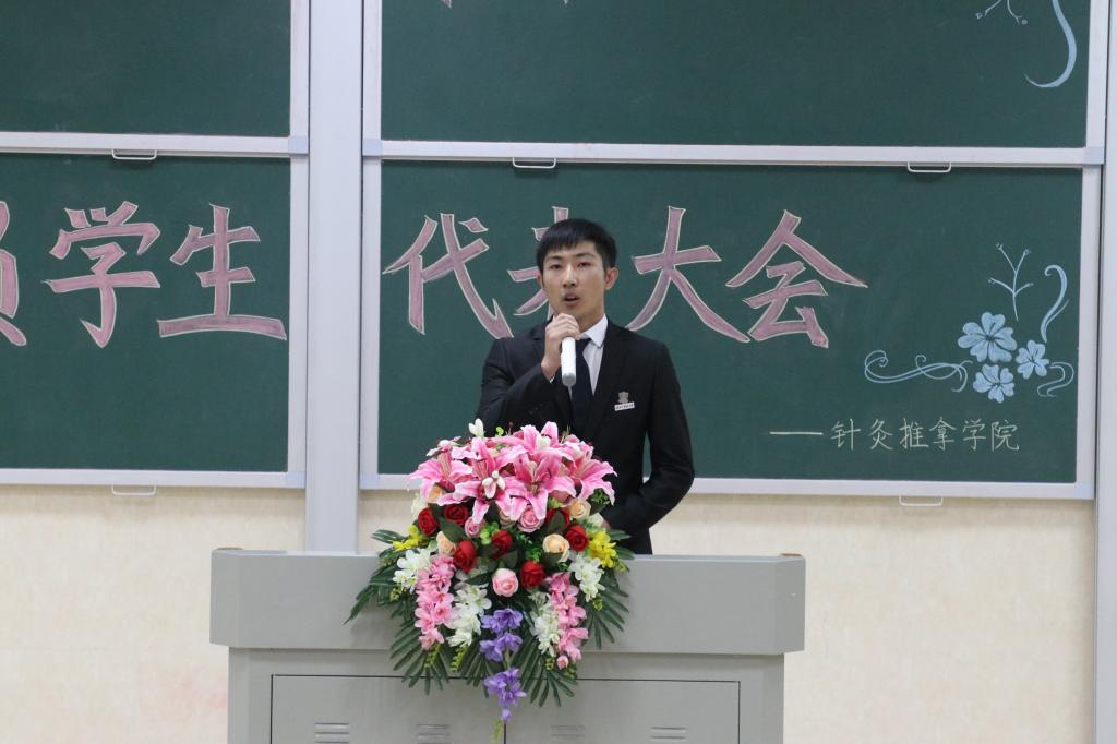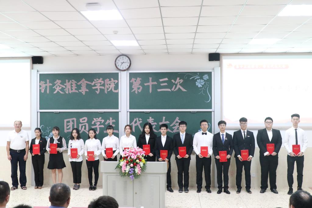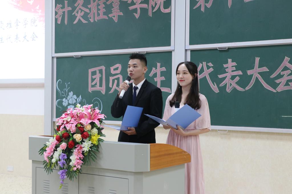 会议在庄严的国歌声中开始,顾星副院长登台致开幕词。他对第十二届分团委学生会在过去一年里的工作表示高度赞许,并表达了对新一届分团委学生会的殷切期望。随后,蒋俊副书记作了讲话。他代表校团委对辛勤筹备大会的师生们表示感谢,并在讲话中以习近平总书记语录“追梦需要激情和理想,圆梦需要奋斗奉献”来鞭策新一届的学生会干部,希望他们为针灸推拿学院的美好明天而努力奋斗。之后便是颁奖环节正式开始。激昂的音乐中,学院领导和老师颁发第十二届分团委学生会优秀干部荣誉证书并合影留念。随后,第十二届分团委副书记李沛丰同学作以《党团领航、青春飘扬、奋力拼搏 、锐意进取,用梦想与激情诠释我院团委工作新篇章》为题的第十二届分团委工作报告;第十二届学生会主席宋源同学作以《在奋斗中实现青春理想、在奉献中历练青春力量、用担当与智慧谱写我院团委学生会工作新篇章》为题的第十二届学生会工作报告。