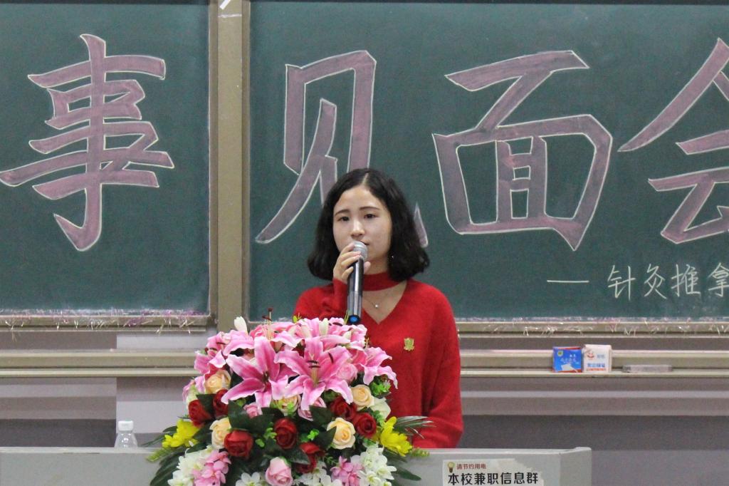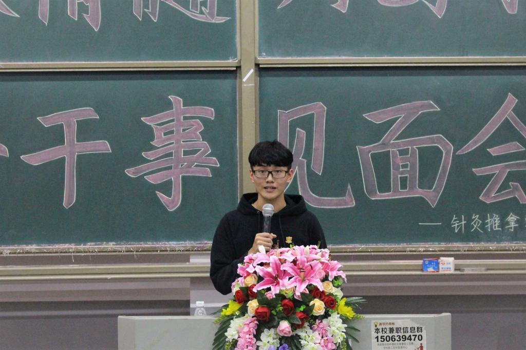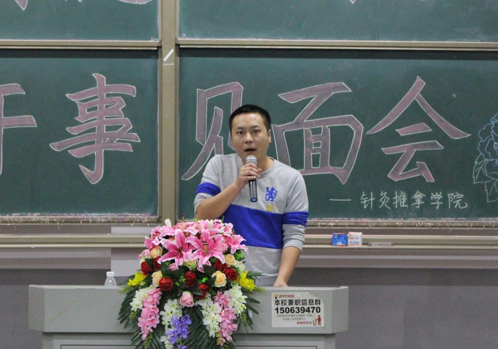 2017年10月11日晚上7点整,针灸推拿学院第十二届分团委学生会以“传承精髓,共创未来”为主题的新老干事见面会在湖南中医药大学含浦校区1206教室进行。出席本次活动的嘉宾有针灸推拿学院分团委书记陈君老师,第十一届分团委副书记袁辉、学生会主席张琳,第十二届分团委副书记李沛丰、学生会主席宋源、副主席郭翔云、朱宁艺、匡泓俊以及第十二届学生会各部门成员。
