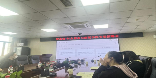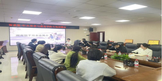 2025年11月27日下午,湖南佰千万健康产业发展有限公司和针灸推拿与康复学院研究生专场招聘会在济世楼十楼会议室成功举办。针灸推拿与康复学院副书记黄容、学生科科长贺圆圆及3名学生科辅导员老师毛璟玲、周增栋、孙静兰出席本场宣讲会,相关专业研究生到场参与。