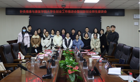 为深入推进学院创新创业教育工作,激发师生创新创业热情,搭建高质量的交流平台,针灸推拿与康复学院于2025年11月18日下午5点在济世楼1002会议室召开大学生创业工作推进会暨创新创业师生座谈会。会议由学院副院长刘密主持,学院党委副书记黄容、各项目团队指导老师、创新创业专干、研究生辅导员及9个项目的学生典型代表共同参与。