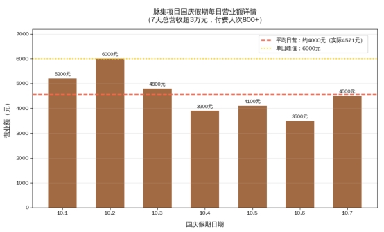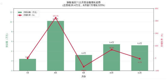 8月公司注册成立,业务实现跨越式发展:8月营业额较7月增长20倍,7—11月总营收突破20万元,付费人次达一万+;在2025年国庆期间,团队经营再创新高——国庆期一周营收超3万元,单日最高营业额突破6000元、平均日营业额约4000元,累计提供健康养生指导2000+次,假期付费人次达800+。实践证明,“中医药+文旅+年轻化健康消费”是一条具备市场需求、可复制可增长的创新赛道。