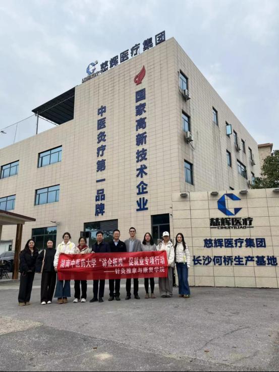 为深入贯彻落实就业优先战略,深化学校和用人单位供需对接,搭建校企交流合作平台,拓宽毕业生就业渠道,12月4日下午,针灸推拿与康复学院副院长刘密带领创新创业导师许明、辅导员何菲菲与本硕博学生一行,赴湖南慈辉医疗科技有限公司开展访企拓岗专项行动,通过了解企业文化、参观走访生产车间及座谈交流等形式,以搭建校企合作新桥梁。湖南慈辉科技有限公司董事长江勇辉、董事长助理兼学术指导总监姚保富全程陪同。